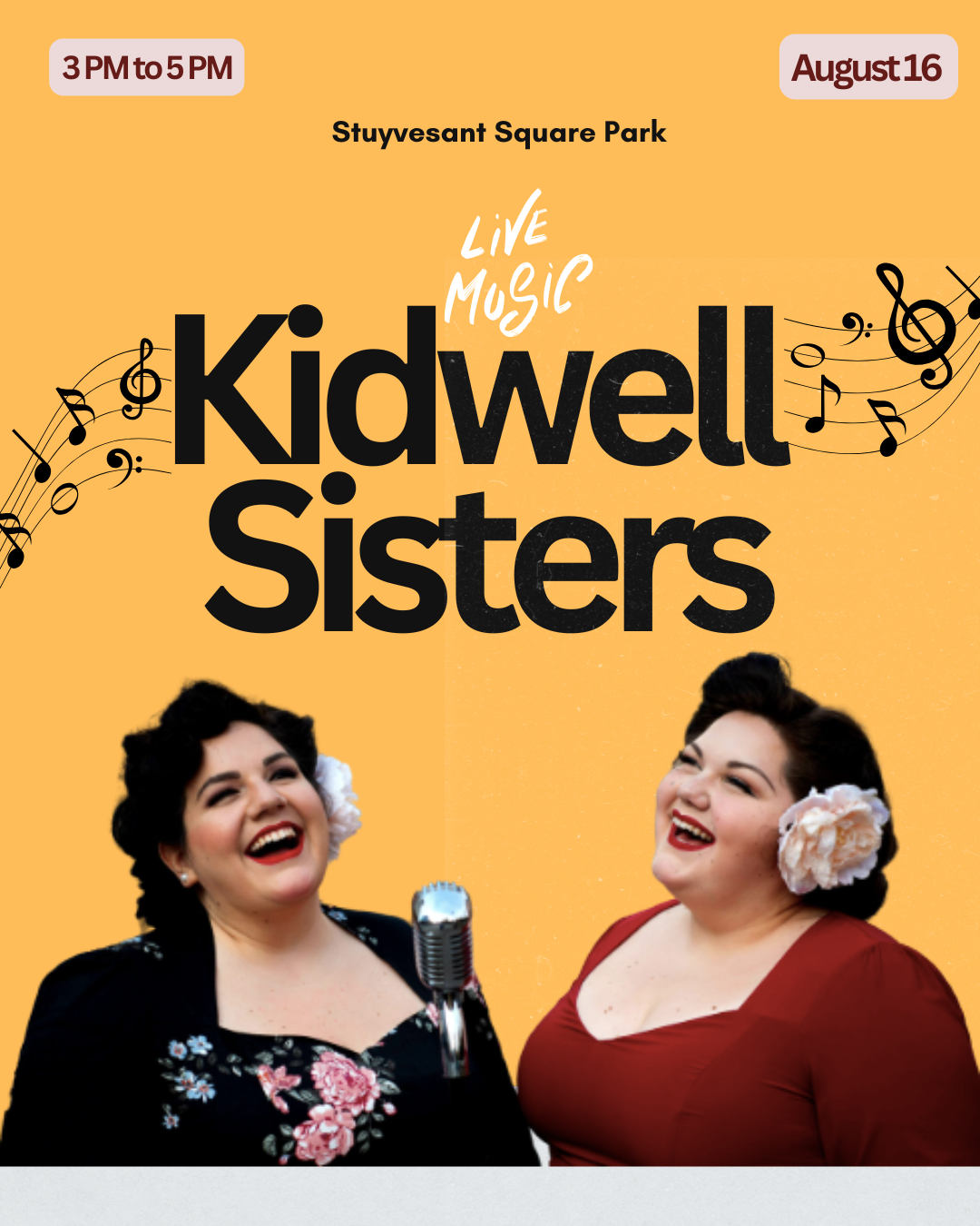 Join us for an unforgettable afternoon of vintage tunes and big city charm with The Kidwell Sisters! Lauren and Hannah Rose Kidwell—“just a couple of jazz cats making a living in the city that never sleeps”—bring their powerhouse vocals and sisterly harmony to Stuyvesant Square Park (West Park) for a lively tribute to Broadway and the golden eras of American music. From 1920s swing to 1960s classics, this free concert is a joyful stroll down memory lane. All ages welcome—come sing along!